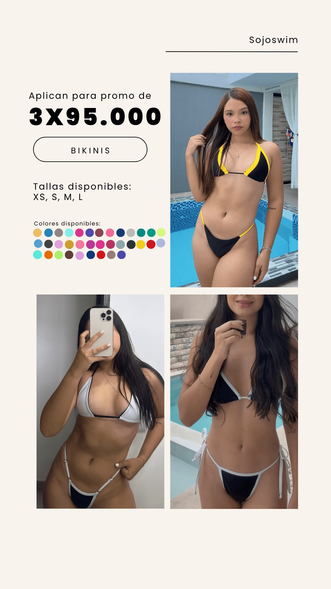 Renová tu look de verano con este combo de 3 bikinis de dos piezas, ideal para disfrutar del sol con estilo y comodidad. Cada bikini está confeccionado con telas suaves, elásticas y de secado rápido, que se adaptan perfectamente al cuerpo y brindan un calce cómodo durante todo el día.