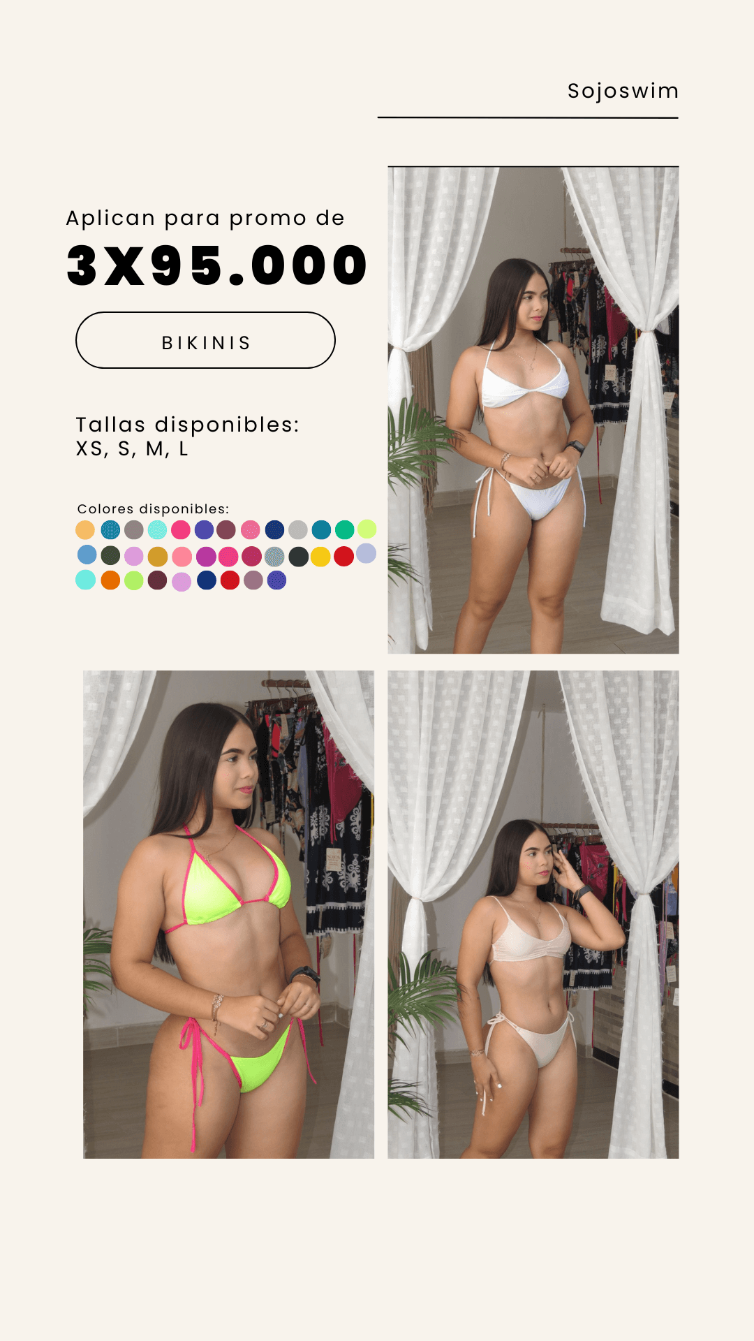 Renová tu look de verano con este combo de 3 bikinis de dos piezas, ideal para disfrutar del sol con estilo y comodidad. Cada bikini está confeccionado con telas suaves, elásticas y de secado rápido, que se adaptan perfectamente al cuerpo y brindan un calce cómodo durante todo el día.