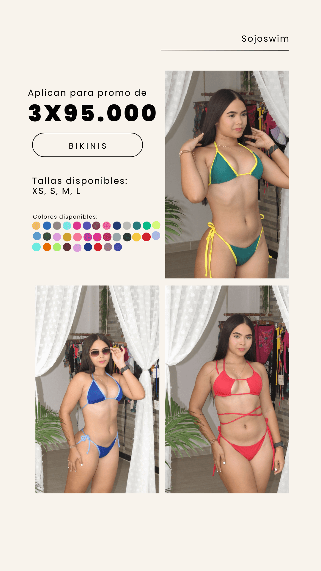 Renová tu look de verano con este combo de 3 bikinis de dos piezas, ideal para disfrutar del sol con estilo y comodidad. Cada bikini está confeccionado con telas suaves, elásticas y de secado rápido, que se adaptan perfectamente al cuerpo y brindan un calce cómodo durante todo el día.
