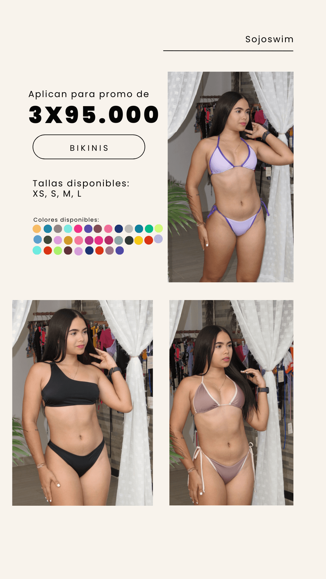 Renová tu look de verano con este combo de 3 bikinis de dos piezas, ideal para disfrutar del sol con estilo y comodidad. Cada bikini está confeccionado con telas suaves, elásticas y de secado rápido, que se adaptan perfectamente al cuerpo y brindan un calce cómodo durante todo el día.