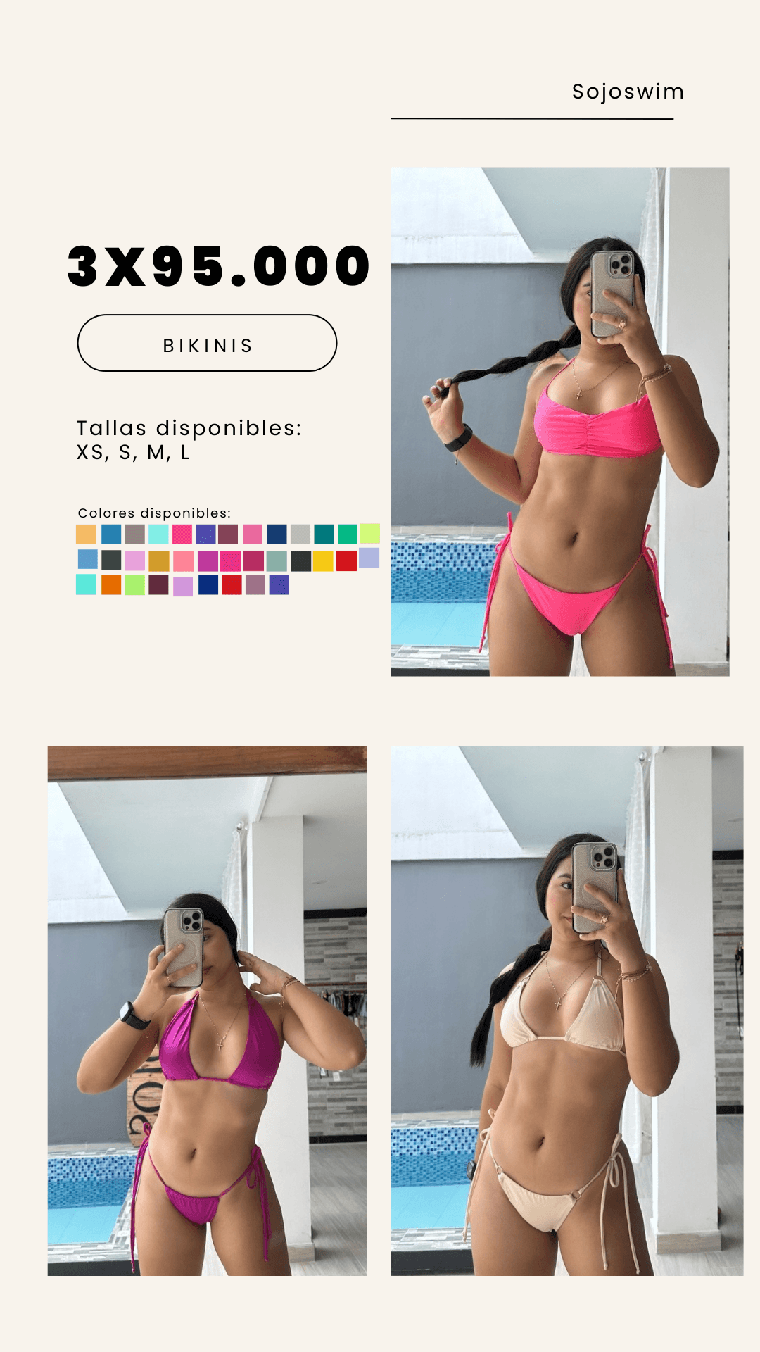Renová tu look de verano con este combo de 3 bikinis de dos piezas, ideal para disfrutar del sol con estilo y comodidad. Cada bikini está confeccionado con telas suaves, elásticas y de secado rápido, que se adaptan perfectamente al cuerpo y brindan un calce cómodo durante todo el día.