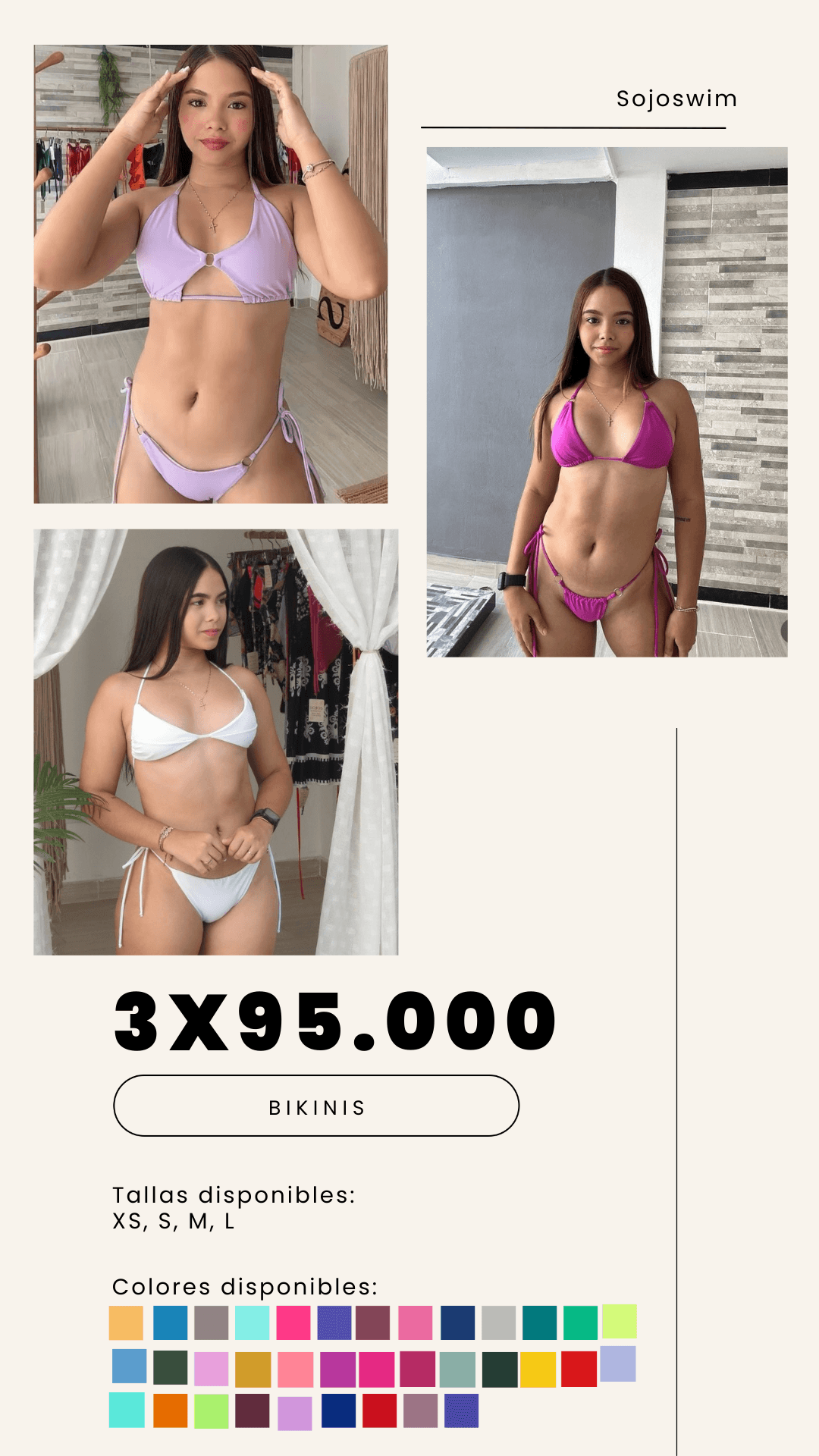 Renová tu look de verano con este combo de 3 bikinis de dos piezas, ideal para disfrutar del sol con estilo y comodidad. Cada bikini está confeccionado con telas suaves, elásticas y de secado rápido, que se adaptan perfectamente al cuerpo y brindan un calce cómodo durante todo el día.